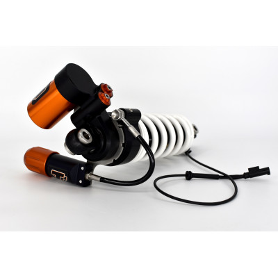 Ammortizzatore Plug & Play ad alte prestazioni con regolazione elettronica dello smorzamento e smorzamento della compressione ad alta e bassa velocità regolabile manualmente. Precarico regolabile idraulicamente per carichi variabili.