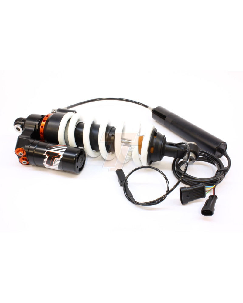 Ammortizzatore Plug & Play ad alte prestazioni con regolazione elettronica del ritorno e regolazione manuale della compressione ad alta e bassa velocità. Regolazione elettronica del precarico.
