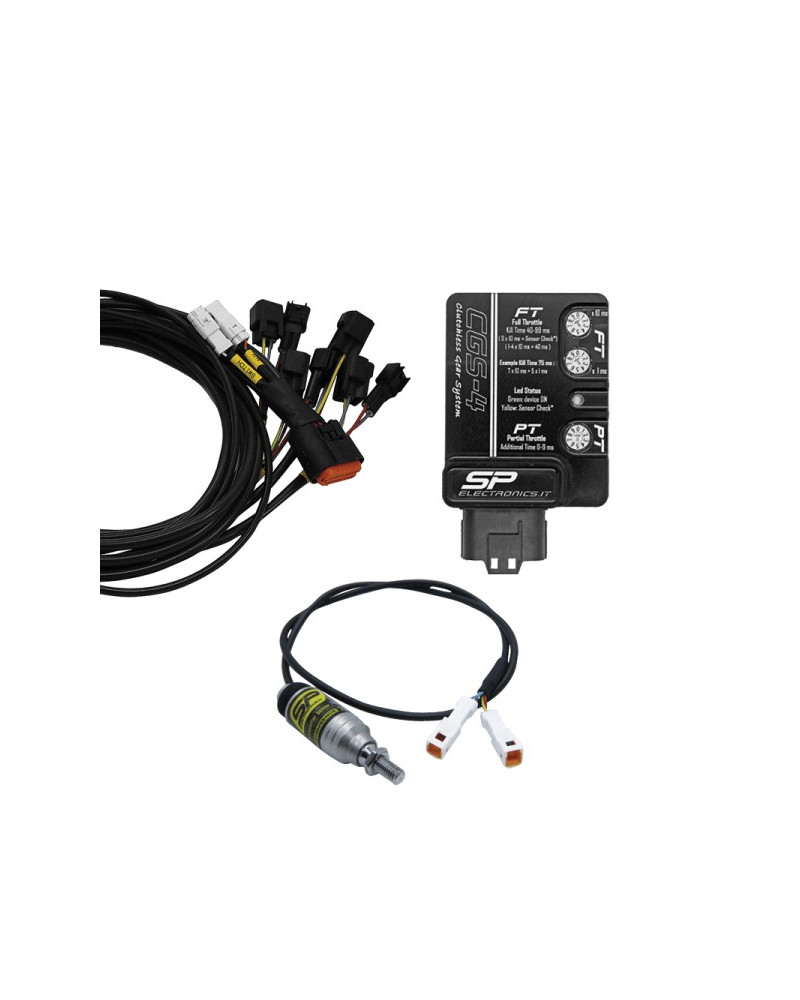 da un sensore elettromeccanico da applicare sul cinematismo del cambio o direttamente sulla leva a seconda dell'applicazione e da un cablaggio Plug&Play di collegamento all’impianto elettrico ORIGINALE della moto, specifico per ogni modello di moto.
